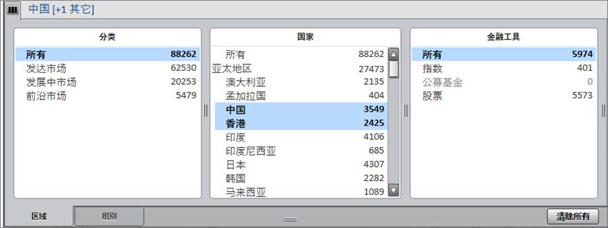 在“区域”选项卡中可根据分类、国家地区和金融工具等选择并应用过滤条件。
