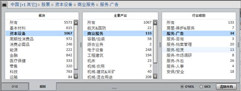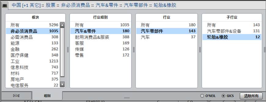 在该选项卡界面右下方可切换行业分类标准。PANARAY现提供O’Neil和GICS®两种行业标准。GICS®包含版块、行业组别、行业、子行业四级分类。