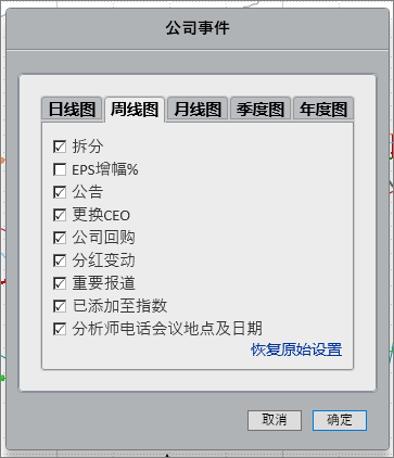 在“股价”菜单中取消勾选“公司事件”可取消显示,或点击“编辑”自定义设置需要显示的事件: