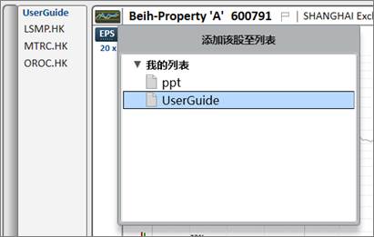 敲击键盘上的插入(Insert)键,可添加当前个股至相应列表。选择“我的列表”中的个人列表,双击即可添加个股。