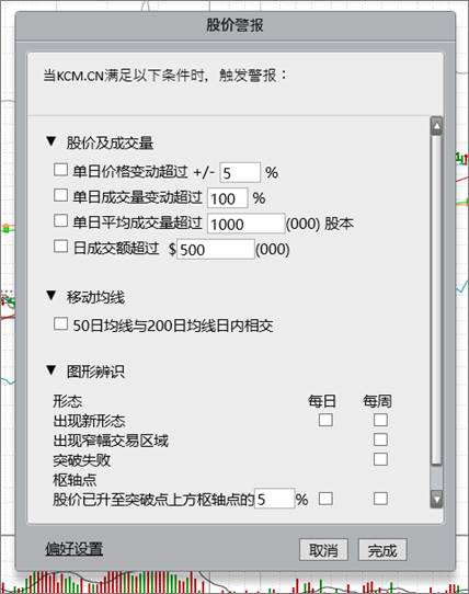 在辅助信息面板“警报”功能区选择 “更多警报”可设置单日股价和成交量变动警报。