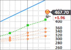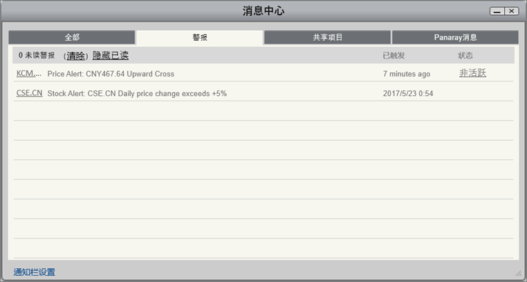 点击喇叭形标志即可进入消息中心。已触发的警报状态显示为“非活跃”,点击“非活跃”文字标签即可切换为“待触发”。点击带下划线的个股代码可查看其数据图表。