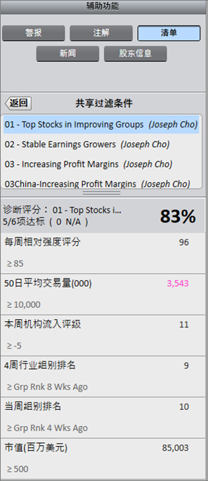 清单功能可将列集使用的筛选条件应用于个股,诊断该股各项筛选条件的达标情况,并显示其达标率。