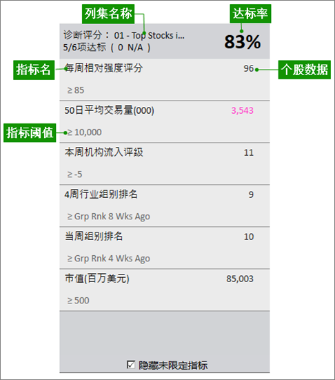 默认设置下,诊股区域仅显示适用当前个股的指标及其达标情况,未设定阈值或指标不适用于当前个股时,则自动隐藏,同时不计入个股达标率。取消勾选“隐藏未限定指标”,可查看当前筛选条件所用全部指标。