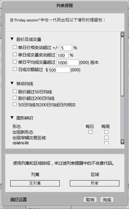 可使用“列集”和“区域”按钮过滤不合意股票。需注意,应用列集过滤条件后,列表警报适用范围将也将随之改变。