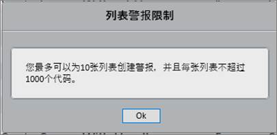 用户最多可为10个列表创建警报,单个列表所含个股数不超过1,000,超出数量限制时,会出现如下弹窗提示。