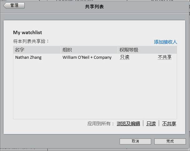 右键单击“我的列表”下任一列表,选择“共享”,点击“添加接收人”即可选择共享对象。