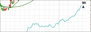 RS线右端的数字与字母分别为相对强度评级与机构流入/流出评级数据。
